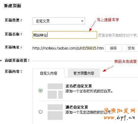 5.在新建頁(yè)面中填寫內(nèi)容,首先在頁(yè)面名稱中寫上“同店轉(zhuǎn)讓”,當(dāng)然不一定要寫這個(gè),寫其他也可以,填寫好頁(yè)面名稱之后,點(diǎn)擊“官方預(yù)置內(nèi)容”,把“同店寶貝轉(zhuǎn)讓”勾選了。(如下圖)