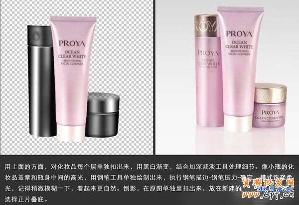 5.運(yùn)用上面的方法把化妝品的每個(gè)圖層都單獨(dú)摳出,接著使用黑白漸變和加深減淡工具處理寶貝細(xì)節(jié)。