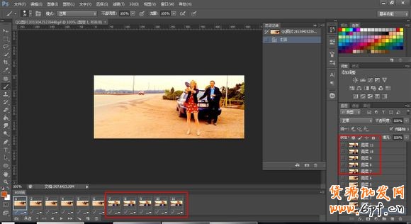 這里我們先打開素材,打開后,我們發(fā)現(xiàn)圖上是有較多的幀數(shù)和圖層,但我們這里并不需要用到這么多,所以,有些圖層我們可以將其刪掉。有剛接觸PS的朋友會問,怎么調(diào)出界面,點(diǎn)擊“窗口”--“時間軸”