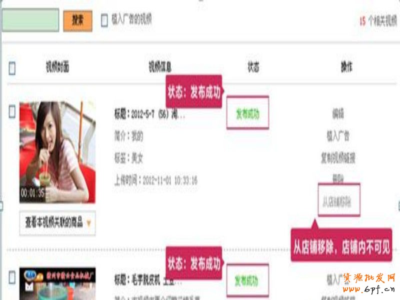 1.在“淘寶視頻”后臺,進(jìn)入“我的視頻”,在視頻列表中尋找“發(fā)布成功”的視頻,點(diǎn)擊“發(fā)布至店鋪”按鈕,該視頻就會發(fā)到您的淘寶店鋪內(nèi)。