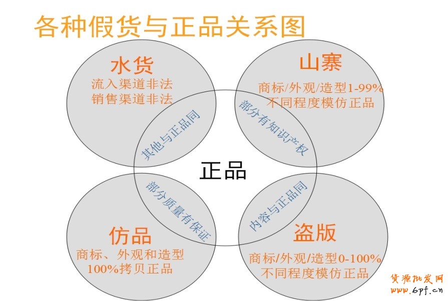 據(jù)《2014年網(wǎng)絡(luò)交易平臺(tái)打假報(bào)告》顯示,假貨有廣義和狹義兩種理解。廣義的假貨,是指與客觀事實(shí)明顯不符,或者不符合相關(guān)標(biāo)準(zhǔn),或者與被司法判定的標(biāo)準(zhǔn)不符的產(chǎn)品。從較嚴(yán)格的法律定義來(lái)看,狹義的假貨主要指假冒、侵犯他人商標(biāo)權(quán)的產(chǎn)品。也就是俗語(yǔ)常說(shuō)的“掛羊頭,賣狗肉”的商品,賣的是狗肉,卻因?yàn)檠蛉怃N量好就包裝成羊肉來(lái)銷售。類似的情況還有,隔壁張三牌的羊肉賣的特別好,你和張三沒(méi)有合作關(guān)系,但是眼紅隔壁生意,就也給自己打上張三的牌子,這就是商標(biāo)侵權(quán)了。又或者,知道直接拿來(lái)用不對(duì),就打了個(gè)“擦邊球”,取名小張三,但無(wú)論品牌標(biāo)志還是標(biāo)語(yǔ)都和張三極其相似,這就是“山寨”了,屬于侵犯知識(shí)產(chǎn)權(quán)。
