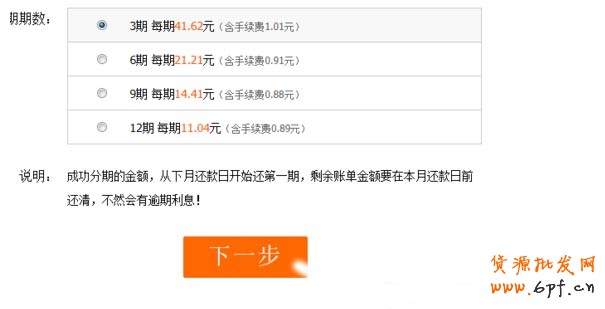 進(jìn)入之后就可以看到分期的這個頁面,然后選擇分期的期數(shù),點擊進(jìn)入下一步。