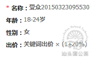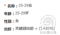 3.自定義人群  針對25-29女、18-24女、30—34女分年齡層進行投放測試效果。其中25-34這部分人群的數(shù)據(jù)反饋較18-24 這部分人群測試情況好。