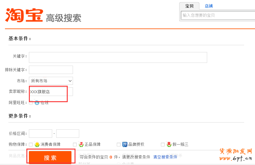 最后再講一下這個表格的制作方法,第一步:大家先打開淘寶網(wǎng)的首頁,可以看到搜索框右側有一個高級搜索功能。  打開高級搜索,如圖在賣家昵稱這一欄里輸入你的店鋪名稱,比如XXX旗艦店,然后點擊回車。  然后你就可以看到下面這樣的界面,右側有你的全店寶貝數(shù)量:  接下來你在賣家昵稱右邊的搜索框里輸入你要查詢的關鍵詞,你就可以看到這個詞你在店鋪里用了幾次了。  你只要把你詞庫里的關鍵詞在這里都差一次就可以得到如上的表格來分析你的店鋪關鍵詞使用次數(shù)了。如果你的詞庫有兩百個詞的話,最多20分鐘就可以查完。