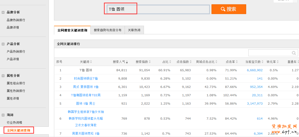 所以首先第一步:先建立一個關鍵詞庫,這個關鍵詞庫里面的關鍵詞都是能用的。詞庫的建立步驟:先從數(shù)據(jù)魔方的行業(yè)熱詞榜里把我們要做的這個類目Top500關鍵詞導出來。  然后把這個關鍵詞在Excel里面進行篩選,要確保剩下的關鍵詞都是本店能用的,并且排除一些搜索量非常大, 轉化超級低的刷單關鍵詞。當然如果你覺得行業(yè)的Top前500的關鍵詞還滿足不了你,你可以通過數(shù)據(jù)魔方的全網(wǎng)淘詞功能再挖掘更多的關鍵詞。方法是你把本類目的主詞、屬性詞、賣點詞整理出來,然后放到全網(wǎng)淘詞里面取查詢,從而找到更多你可以用的關鍵詞,如下圖:  好了,到這一步,基本的詞庫算是建立完畢了。那么接下來就是要確保這里的關鍵詞都已經(jīng)用上了,而且用的次數(shù)也是合理的。這個怎么判斷呢?一起來看一個表格:  這是某家男裝店男士T恤這個類目行業(yè)Top500關鍵詞在店鋪內使用的情況。大家看到這個數(shù)據(jù)不知道有何發(fā)現(xiàn),這家店的短袖T恤有61款,但是男士短袖T恤這個行業(yè)最大的詞竟然只使用了29次,這明顯是不合理的,因為男士短袖T恤這個詞要獲得展現(xiàn),必須在標題里有這個詞才行。  這就相當于還有32款寶貝少用了一個最大的主詞,而且下面男士修身T恤這個詞,目前店鋪里只有一款寶貝在使用,這也是很不合理的。因為這個詞的流量還是很大的,一款寶貝靠一個詞肯定很難獲得很多搜索流量,人多力量大,這在搜索里也是符合的,一個關鍵詞使用的次數(shù)多,獲取流量的能力相對就會強。所以通過這個數(shù)據(jù)就可以取分析,店鋪內目前哪些詞使用的次數(shù)不合理,可以多使用幾次,另外那些屬性是市場需求比較大的,可以去布局這樣的一些產(chǎn)品上去的。