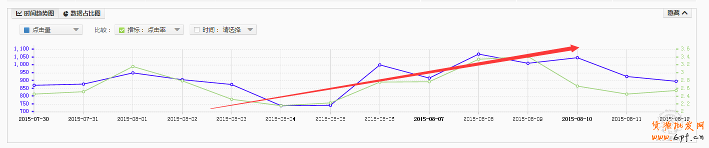 分析:該報表為該賬戶枕頭計劃的數(shù)據(jù)情況,總體看來,過去14天情況,流量上是逐步提升的,在成交量上,近期成交轉(zhuǎn)化大幅提升,ROI相應(yīng)有所上升,趨于逐步上升走勢。隨著直通車流量的逐步升高,ppc慢慢降低下來。