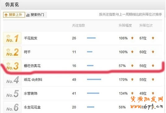 從上圖中可以看出,現(xiàn)在柵欄仿真花這個關(guān)鍵詞的上升趨勢很大,一是表明市場上柵欄花的銷量趨勢還不錯,為我們店鋪開發(fā)新品提供了一個參考。而且對應(yīng)的相關(guān)產(chǎn)品,也應(yīng)馬上添加這個飆升的關(guān)鍵詞。