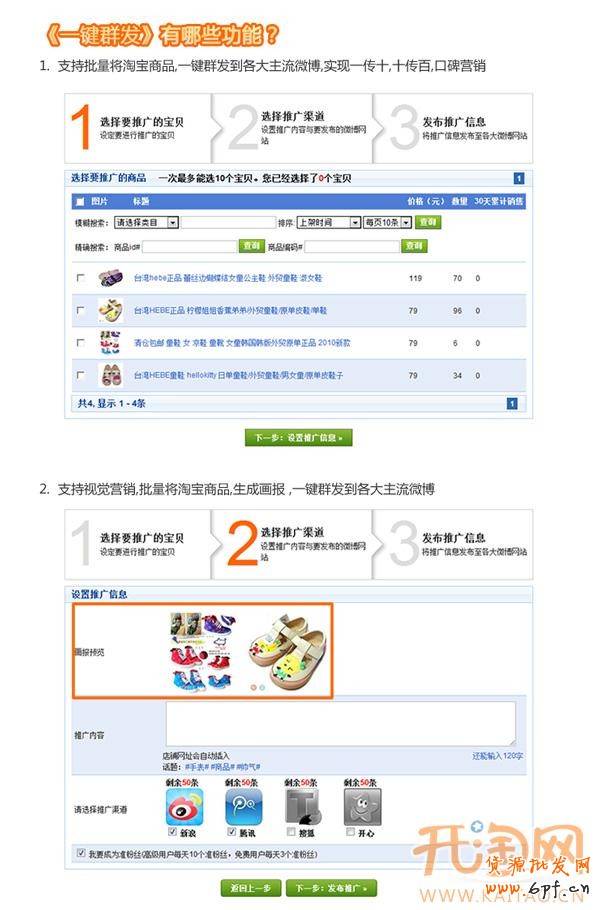 “一鍵轉發(fā)”是由推廣大師出品,必屬精品,一鍵群發(fā)通過綁定各大主流微博賬號,將店鋪寶貝一鍵群發(fā)到各大微博平臺,借微博平臺快速宣傳自己的寶貝,實現一傳十,十傳百,百傳千效應,支持子賬號,淘寶商城,旺鋪,分銷等賣家免費試用 。