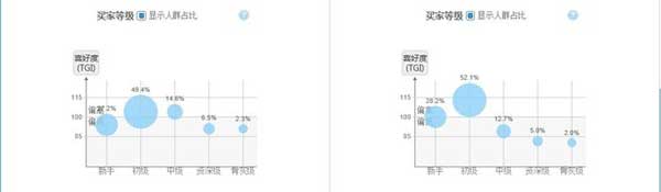 柱形是這個(gè)詞的消費(fèi)基數(shù),線型全網(wǎng)的消費(fèi)基數(shù)?;旧隙际侵袑酉M(fèi)等級(jí)居多。