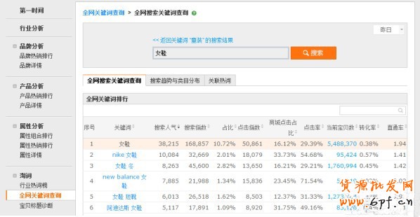 利用數(shù)據(jù)魔方淘詞,這對于很多推廣操手來說,應(yīng)該不陌生吧!他也是淘寶官方數(shù)據(jù)分析的工具之一,有標(biāo)準(zhǔn)版和專業(yè)版,兩個(gè)都有淘詞這一功能,淘詞是我們開車的必備工具,其中里面可以對任何關(guān)鍵詞進(jìn)行全網(wǎng)關(guān)鍵詞查詢,查詢結(jié)果為默認(rèn)搜索人氣從高到底排行,從人氣排行的數(shù)據(jù)顯示看,我們也可以知道該關(guān)鍵詞的搜索熱度,比如,搜索“女鞋”,如下圖: