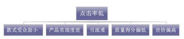一般來(lái)說(shuō),在直通車(chē)推廣中,車(chē)能否順利開(kāi)起來(lái),點(diǎn)擊率是最核心的問(wèn)題,它不僅是影響質(zhì)量得分的核心因素,也是打造爆款引流的先決條件,凡是爆款寶貝,點(diǎn)擊率都不會(huì)太低。而點(diǎn)擊率很低的寶貝,也很難成為爆款,若堅(jiān)持要推廣此寶貝的話(huà),耗費(fèi)的代價(jià)和成本絕對(duì)很高。所以點(diǎn)擊率決定直通車(chē)的成敗,決定爆款的走向。而點(diǎn)擊率低的原因是什么?會(huì)有什么樣的后果?我們可以看一下以下這兩張思維導(dǎo)圖。