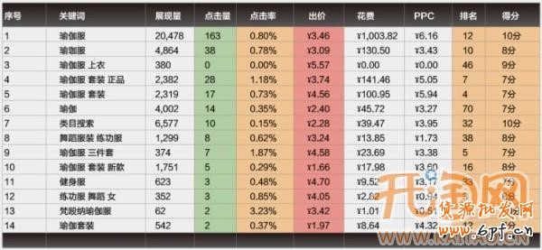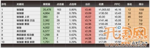 1.如“梵歐納瑜伽服”等關(guān)鍵詞展現(xiàn)量較低,就可以通過(guò)寶貝屬性、類目等去分析影響的原因。另外得分較低的詞就可以刪除。