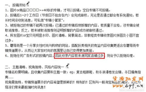 和美麗說一樣,蘑菇街也可以“創(chuàng)建專輯”申請“精彩專輯”,不過這個比較復(fù)雜。在投稿須知中,有一條是“收錄內(nèi)容若來源同家店鋪過多,會被拒絕處理”,因此不能盲目只放自家的產(chǎn)品。