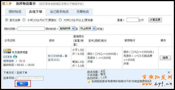 確認(rèn)好第一、二步信息后,在第三步中選擇“在線下單”,在您所選擇的物流公司后點(diǎn)擊“選擇”。