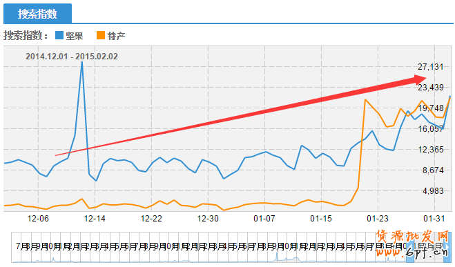 接手的時(shí)間是在12月初,通過數(shù)據(jù)分析,堅(jiān)果及特產(chǎn)在每年的一月以后搜索指數(shù)處于增長高峰期,從時(shí)間節(jié)點(diǎn)上來看,主營產(chǎn)品還是有一定優(yōu)勢(shì)的。