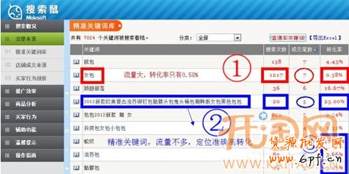 這是一家皇冠做女包的店鋪,紅色標注①關(guān)鍵詞,帶來1200多流量,但成交只有7筆,轉(zhuǎn)化率0.58% 。下面藍色框②的關(guān)鍵詞,流量不多,20個流量帶來5筆訂單,轉(zhuǎn)化率25%。你可能說,這是偶然。那么再往下看流量并不高的藍色框③轉(zhuǎn)化率,22.22%、3.66%、3.03%。