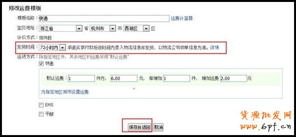 第二步、在“發(fā)貨時(shí)間”選項(xiàng)合理設(shè)置發(fā)貨時(shí)間后,點(diǎn)擊“保存并返回”發(fā)貨時(shí)間設(shè)置即可啟用。