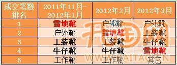 接下來,結合2011年11月-2012年3月為掌柜們重點解析靴子各主要商品屬性的買家偏好情況。以下是男鞋靴子款式按照成交筆數(shù)top排名: