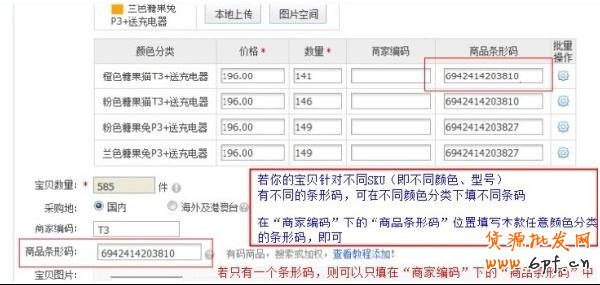 同款商品的不同SKU,可以用同一個(gè)條碼,也可以用不同的條碼,具體的填寫(xiě)方式如下圖:
