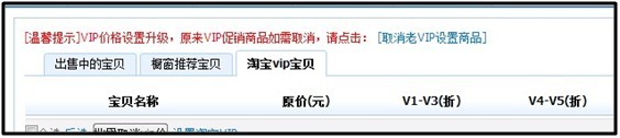 二、點(diǎn)擊“淘寶VIP寶貝”后,會(huì)出現(xiàn)如下紅字,然后點(diǎn)擊“取消老VIP設(shè)置商品”。