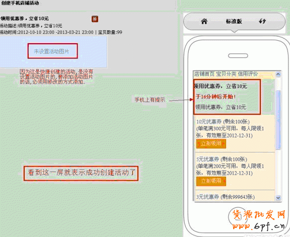 看看三個(gè)活動(dòng)列表在手機(jī)店鋪首頁顯示的形式,也可以操作右邊手機(jī),測(cè)試設(shè)置后的效果.當(dāng)然,親們總共可以創(chuàng)建10個(gè)活動(dòng).