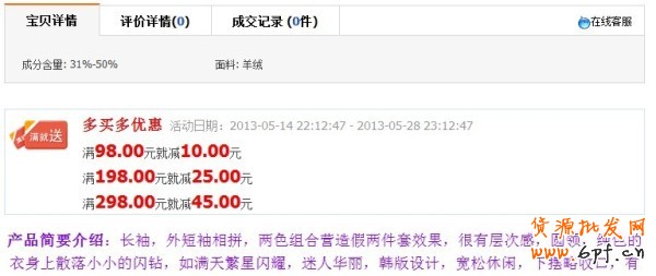 例:設(shè)置全店滿98元減10,滿198元減25元,滿298元建45元,這樣多買多優(yōu)惠的促銷活動,如果買家本來只打算在你店鋪買1件138元的衣服,然后看到你這個(gè)活動滿198元減25元,就會再在你店鋪挑一件60元左右的T恤,來湊滿198元可以享受到這個(gè)活動,這樣就大大提高了店鋪的銷量。