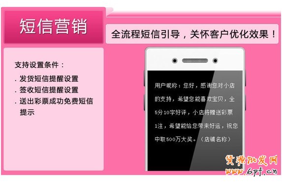 3、短信引導(dǎo),設(shè)置發(fā)貨,或確認(rèn)收貨或簽到后,給買家自動發(fā)送短信提示,讓買家在收到貨后,可以第一時(shí)間就了解到活動,并積極參與進(jìn)來。