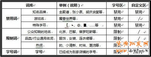 禁用詞指不能出現(xiàn)的詞;限制詞指可以出現(xiàn)和包含,但不能單獨(dú)出現(xiàn)的詞;字號(hào)區(qū)不能全部由限制詞構(gòu)成;