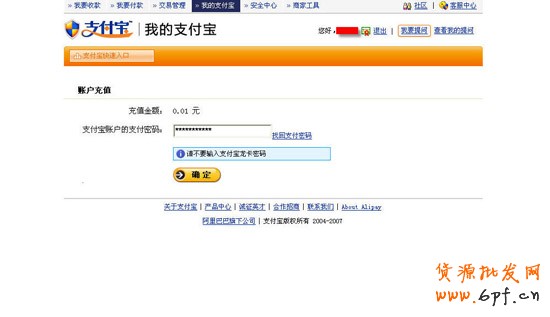 2、輸入您的支付寶賬戶的支付密碼(注意:非銀行卡取款密碼)