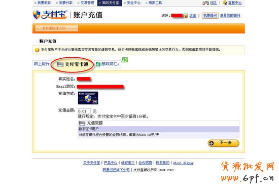 1、選擇“支付寶卡通”進行充值,輸入充值金額,點擊“下一步”