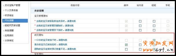 買家在賣家店鋪拍下商品但沒系統(tǒng)提示時,請您檢查一下您的網(wǎng)站提醒是否設置到位,可以登錄“我的淘寶”—“賬號管理”—“網(wǎng)站提醒” —“消息訂閱”,在“成交通知”版塊,查看版塊中的“一口價的寶貝被拍下時,請通知我 ”、“競價的寶貝已被拍走時,請通知我 ”、“團購的寶貝結束時預訂數(shù)量不足,請通知我 ”三種情況是否開通阿里旺旺提醒,其中有兩項在開通阿里旺旺提醒的同時還可以開通站內(nèi)信和郵件的提醒,如您沒有勾選請及時勾選哦,以免錯失生意,如下圖: