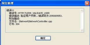 網(wǎng)店學堂網(wǎng)地瓜發(fā)現(xiàn)很多人出現(xiàn)這個問題,淘寶助理上傳錯誤304,當我登錄淘寶助理,出現(xiàn)淘寶助理上傳錯誤這個頁面時:“錯誤! 錯誤號: HTTPCTLERR_VALIDATE_USER 錯誤描述: 驗證用戶失敗,錯誤碼為 2090009019. 附加描述: 文件名: ./Network/NetworkController.cpp 行號: 304”如下圖: