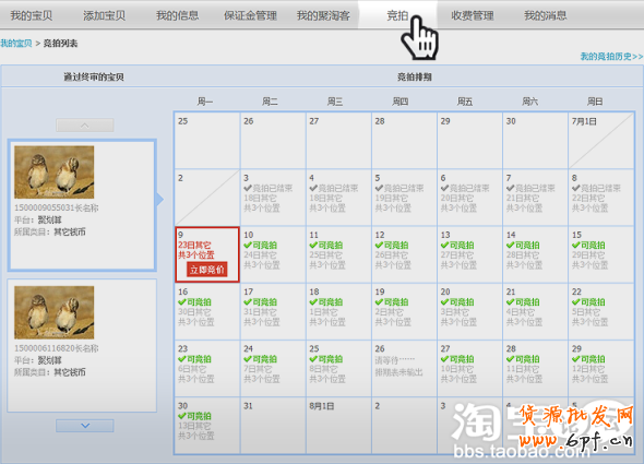 第一步: 先進(jìn)入自己的聚劃算后臺(tái),點(diǎn)擊“競(jìng)拍”出現(xiàn)競(jìng)拍日歷(商品通過(guò)審核的第二天)。