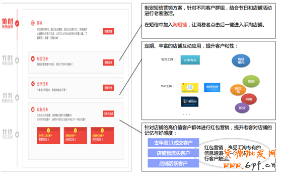 還有非常重要的一點,就是我們需要在預(yù)熱前期的這個階段,在店鋪里面去引入無線互動工具,向消費者提供定期的店鋪內(nèi)互動。最簡單有效的方式,就是采購一個第三方服務(wù)商的CRM無線互動應(yīng)用,這些應(yīng)用通常都幫賣家設(shè)置了多達(dá)20多種的互動任務(wù),賣家可以根據(jù)自己店鋪的特點在去設(shè)置具體的任務(wù),讓消費者每日進(jìn)店來完成任務(wù),獲得積分或者紅包等獎勵。通過這樣常態(tài)化并且有趣的一些任務(wù)來讓消費者養(yǎng)成每天進(jìn)店做任務(wù)領(lǐng)獎勵的習(xí)慣。這樣整個店鋪的人氣就上來了,客戶的活躍也做起來了。無線互動應(yīng)用的涌現(xiàn),也是在整個平臺無線化趨勢下的一個大變化,這些應(yīng)用可以很好的幫助賣家做無線店鋪的客戶互動。商家可以從服務(wù)市場上尋找一些優(yōu)秀的第三方服務(wù)商提供的CRM無線互動應(yīng)用,布局在手淘店鋪內(nèi)做客戶互動與粘性。
