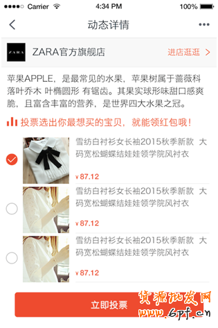 賣家設(shè)置幾款寶貝讓消費者選款,同時關(guān)聯(lián)獎池,通過微淘推送給消費者。消費者自主選款,投票后可根據(jù)商家設(shè)置的概率抽獎獲得獎品。
