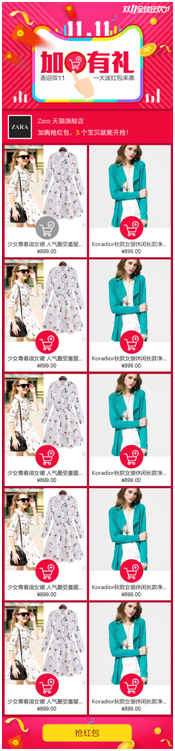 所有的紅包玩法在前臺都將有專屬的可點擊標(biāo)簽,消費者可直接進(jìn)入玩法的聚合頁面。與此同時,在雙十一期間的廣場頁面(廣場tab改名為“雙十一”),也會增加熱門玩法的透出,以便消費者更快速的進(jìn)入各類玩法的落地頁,同時為賣家設(shè)置的各類玩法爭取更多曝光。