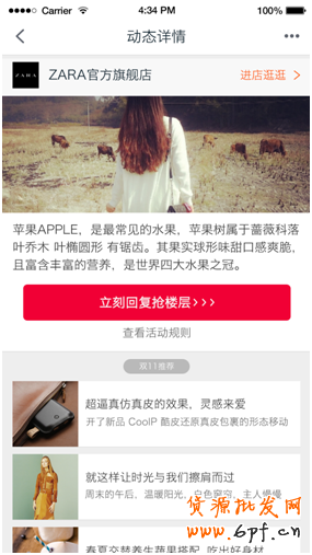 •玩法:參加雙十一的賣家可以在無線運營中心通過“發(fā)寶貝”將雙11寶貝推送到微淘,消費者點擊卡片上的“雙十一狂歡”標(biāo)簽可直接跳轉(zhuǎn)聚合落地頁