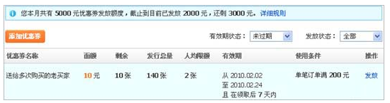 1)平臺(tái)根據(jù)賣(mài)家信用等級(jí),分配了不同的發(fā)放額度,額度=張數(shù)×面額。例如:您本月有5萬(wàn)元發(fā)放額度,則可發(fā)放出去1萬(wàn)張5元優(yōu)惠券;