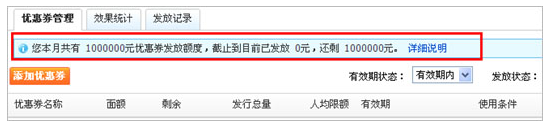 2)每月月初您可在“優(yōu)惠券管理”頁(yè)面查看當(dāng)月總發(fā)放額度(如下圖所示),已成功發(fā)放的優(yōu)惠券才會(huì)扣減當(dāng)月發(fā)放額度,若發(fā)放失敗,額度不扣減;