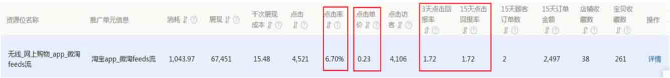 從圖中可以看出,商家測試的微淘資源位點(diǎn)擊率在6.7%左右,點(diǎn)擊單價(jià)更是低到0.23元,轉(zhuǎn)化率也接近2。