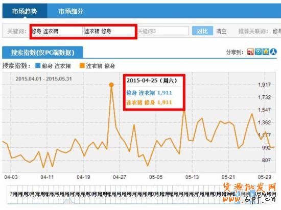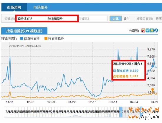 通過上圖數(shù)據(jù)顯示和關(guān)鍵詞設(shè)置成有空格,即使順序顛倒了,但是搜索量還是一樣的。但如果關(guān)鍵詞當(dāng)中是沒有空格的,在搜索“修身連衣裙”和“連衣裙修身”時,關(guān)鍵詞的順序顛倒,搜索量卻差了很多倍。