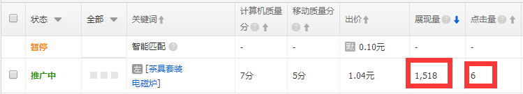 比如這個(gè)詞“茶具套裝電磁爐”首先我們看一下它的行業(yè)平均點(diǎn)擊率是多少,通過(guò)流量解析:這個(gè)詞PC端的平均點(diǎn)擊率是0.3%,它的3倍,也就是0.9%,需要的點(diǎn)擊量是:1518*0.9%-6=7.662。