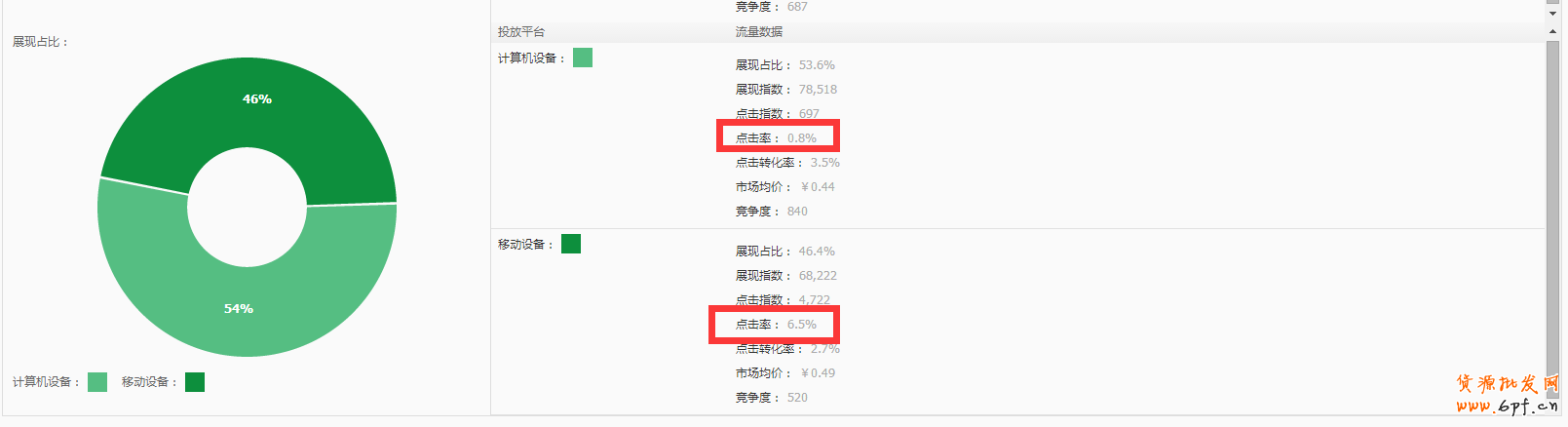平均點(diǎn)擊時(shí)1.47%,但是PC端的點(diǎn)擊只有0.54%,無(wú)線端的點(diǎn)擊有3.62%,很明顯PC端的點(diǎn)擊不達(dá)標(biāo),這就意味著你的點(diǎn)擊率很高,但是權(quán)重就是不增長(zhǎng),出現(xiàn)這種問(wèn)題時(shí),只要打開流量解析,看一下你的主搜關(guān)鍵詞,比如說(shuō)我們剛才的“星空棒棒糖“,看一下數(shù)據(jù)透視表當(dāng)中,有不同平臺(tái)和不同維度下的點(diǎn)擊率,行業(yè)中計(jì)算機(jī)的平均點(diǎn)擊率是0.8%,移動(dòng)端的平均點(diǎn)擊率是6.5%,兩個(gè)數(shù)值都很明顯低于行業(yè)均值,所以表面看起來(lái)點(diǎn)擊率還可以,但實(shí)際上權(quán)重并不高的原因。