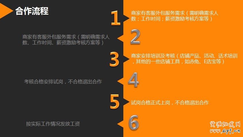 我們流程是:人才庫(kù)征集——商家客服強(qiáng)化培訓(xùn) & 考試——商家招募——推薦上崗——效果跟蹤。