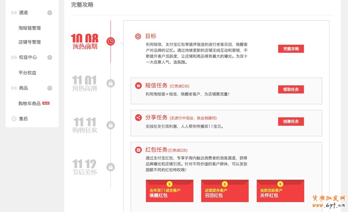 雙11專區(qū)會(huì)按照雙11的不同階段(預(yù)熱前期(10.8-10.31)、預(yù)熱高潮(11.1-11.10)、大促當(dāng)天(11.11),大促后(11.11-)),分別為大家提供不同的預(yù)熱實(shí)操秘籍和預(yù)熱效果數(shù)據(jù)展示。專區(qū)集合了今年最新的無(wú)線互動(dòng)玩法(淘短鏈、分享有禮、紅包營(yíng)銷、密令紅包、微淘玩法等等),有實(shí)時(shí)的預(yù)熱效果數(shù)據(jù)幫助你跟蹤預(yù)熱效果,有預(yù)熱秘籍吐血分享。