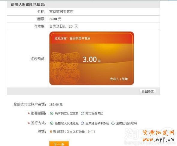,上面的名稱就是填你的客戶會員名,面額應(yīng)該不用我說了,就是紅包的金額,自己定,3元,5元,都可以,按自己店產(chǎn)品的實際情況訂,有效期記得最多不超過30天哦,30天后如果客戶沒有使用該紅包,錢還是會回到您的帳戶的,填好了以后點下一步