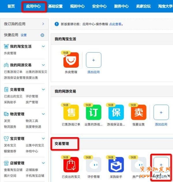2)賣家需要打開新版賣家中心,如下圖顯示,點擊應用中心,選擇交易管理,選擇分期管理應用。