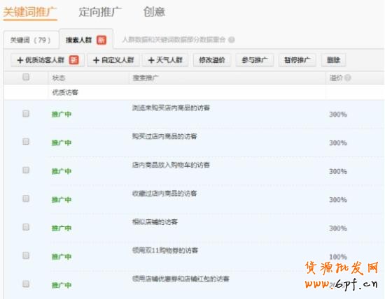2、通用詞出低價(jià)然后搜索人群高溢價(jià)。因?yàn)橥ㄓ迷~面對(duì)的人群很廣,例如“面膜”這個(gè)關(guān)鍵詞,搜索這個(gè)關(guān)鍵詞的有想買(mǎi)補(bǔ)水保濕面膜的,有想買(mǎi)美白面膜的,還有想買(mǎi)祛痘面膜的,這些人都會(huì)搜索“面膜”。無(wú)論你的面膜功能多全,知名度多高,必定大部分人都不會(huì)買(mǎi)你的面膜。如果你直接出高價(jià)搶占第1名,結(jié)果自然是虧死。此時(shí)的策略是低出價(jià),低到第一名出價(jià)的1/4左右,然后通過(guò)“搜索人群”功能給優(yōu)質(zhì)訪客增加300%的溢價(jià)。這樣做的目的是讓搜索這個(gè)關(guān)鍵詞的人大部分看不到你,但是你店鋪的優(yōu)質(zhì)訪客可以在第1名的位置看到你的推廣。如下圖所示: