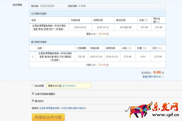 step3.點擊確定后,系統(tǒng)進入服務(wù)市場進行類目變更的訂單變更操作。詳見下圖(注意類目變更無需另外增加費用,此處生成的是一個0元的訂單)。在同意支付協(xié)議,顯示“訂購成功”后,類目變更即成功。