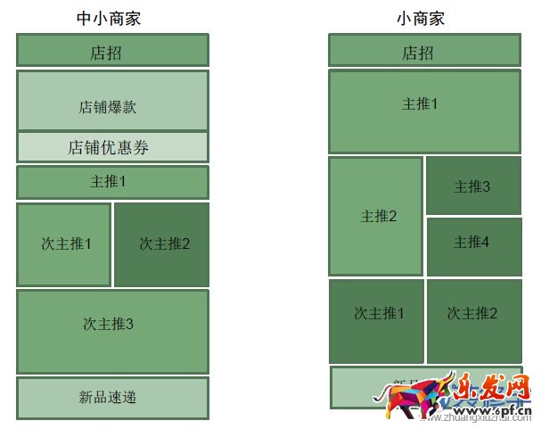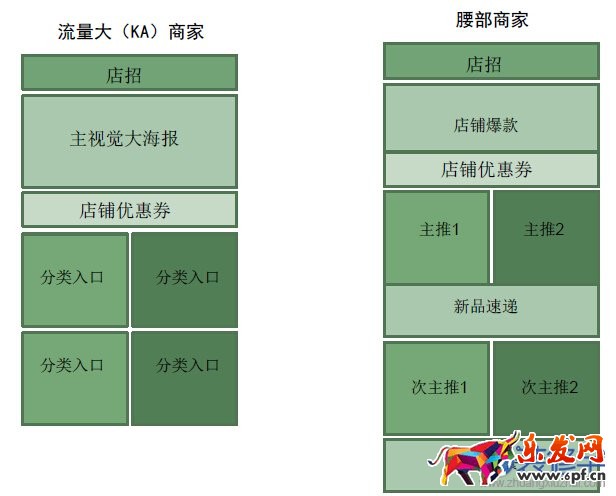 流量越大,首頁(yè)設(shè)計(jì)就越要進(jìn)行流量分配,盡量多使用活動(dòng)專題,品類分類,上新的和二級(jí)頁(yè)面等,否則就要以聚合為主。KA商家可以自定義設(shè)計(jì)首頁(yè)元素,中小商家建議用第三方模版即可,元素已經(jīng)規(guī)范好, 選適合自己流量分配的模版。
